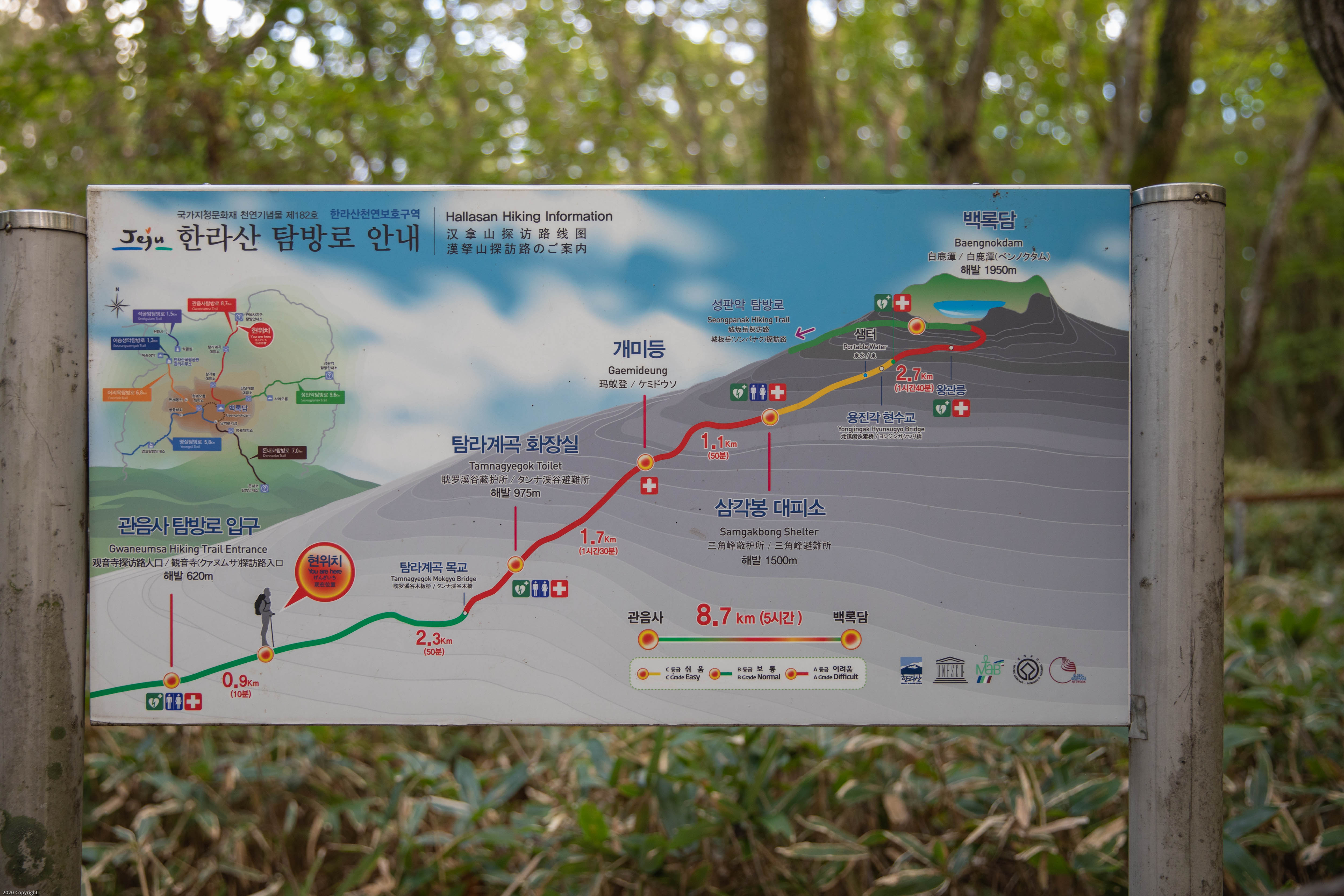 산행시작: 07시, 정상도착 12시 30분(중간에 삼각봉대피소에서 간식을 위해 40분 정도 휴식), 성판악 휴게소 도착: 16시 30분(여유있게)